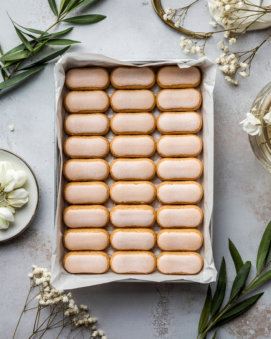 Arrange dipped biscuits in a single layer at the bottom of the tray, trimming as needed to fit.