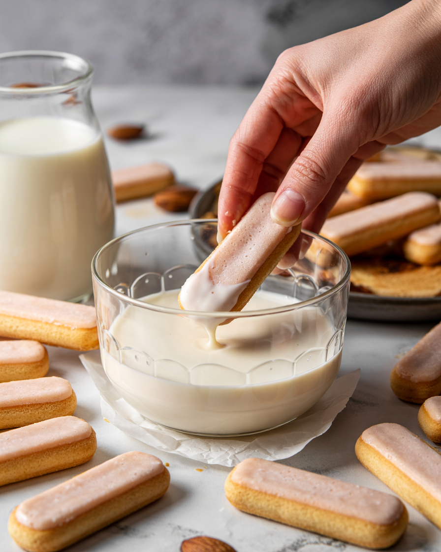 Quickly dip each ladyfinger or biscuit into almond milk, just enough to soften without soaking.