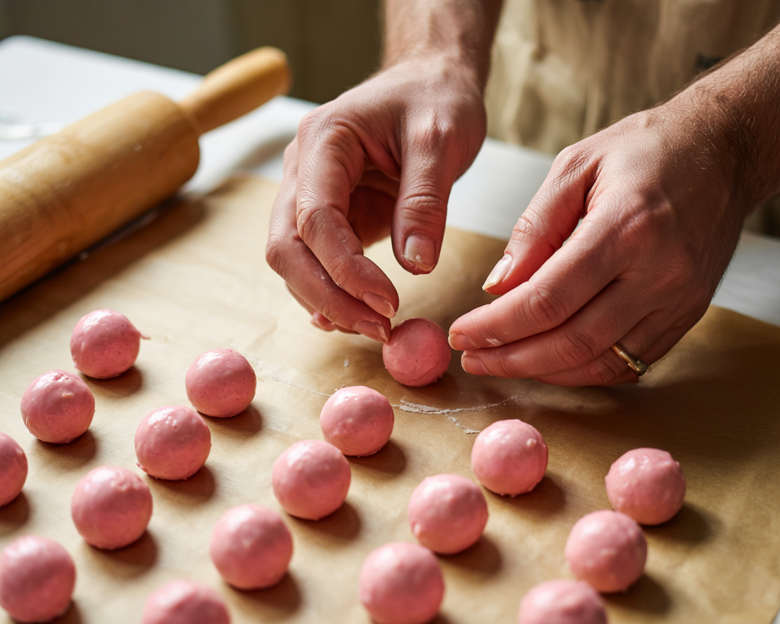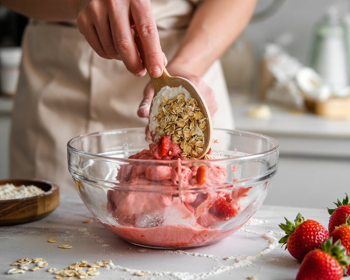 Stir in oat flour, protein powder, and crushed freeze-dried strawberries until dough forms.