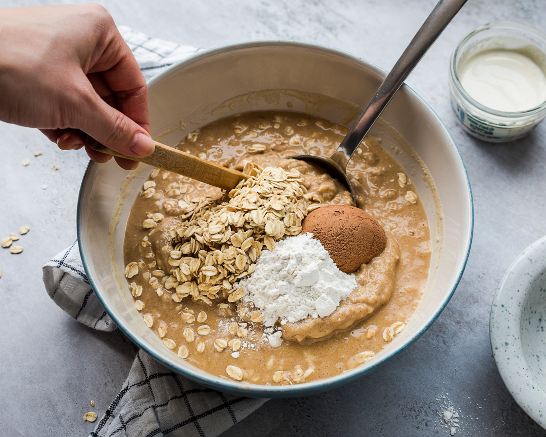 Stir in rolled oats, protein powder, baking powder, and salt until evenly combined.