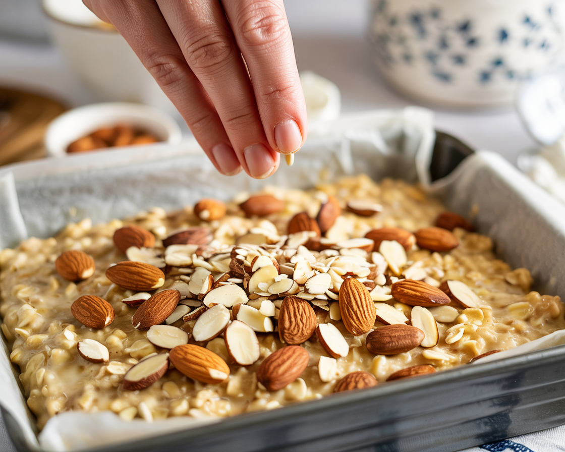 Sprinkle sliced almonds evenly over the top of the oatmeal.