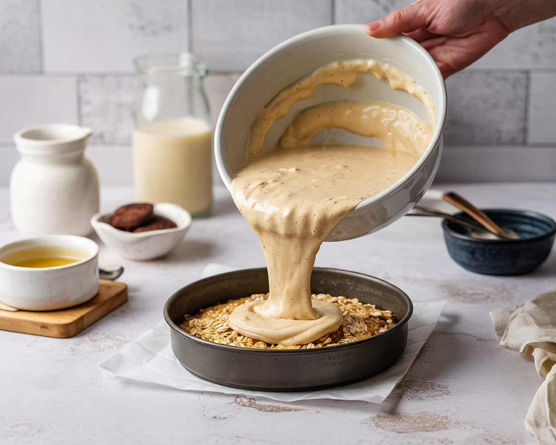 Pour the oatmeal mixture into the prepared baking dish and smooth the top evenly.