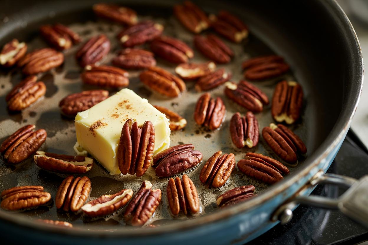In a small skillet, melt the vegan butter and add pecans. Stir in maple syrup and cinnamon. Toast for 2โ3 minutes until glossy and caramelized.