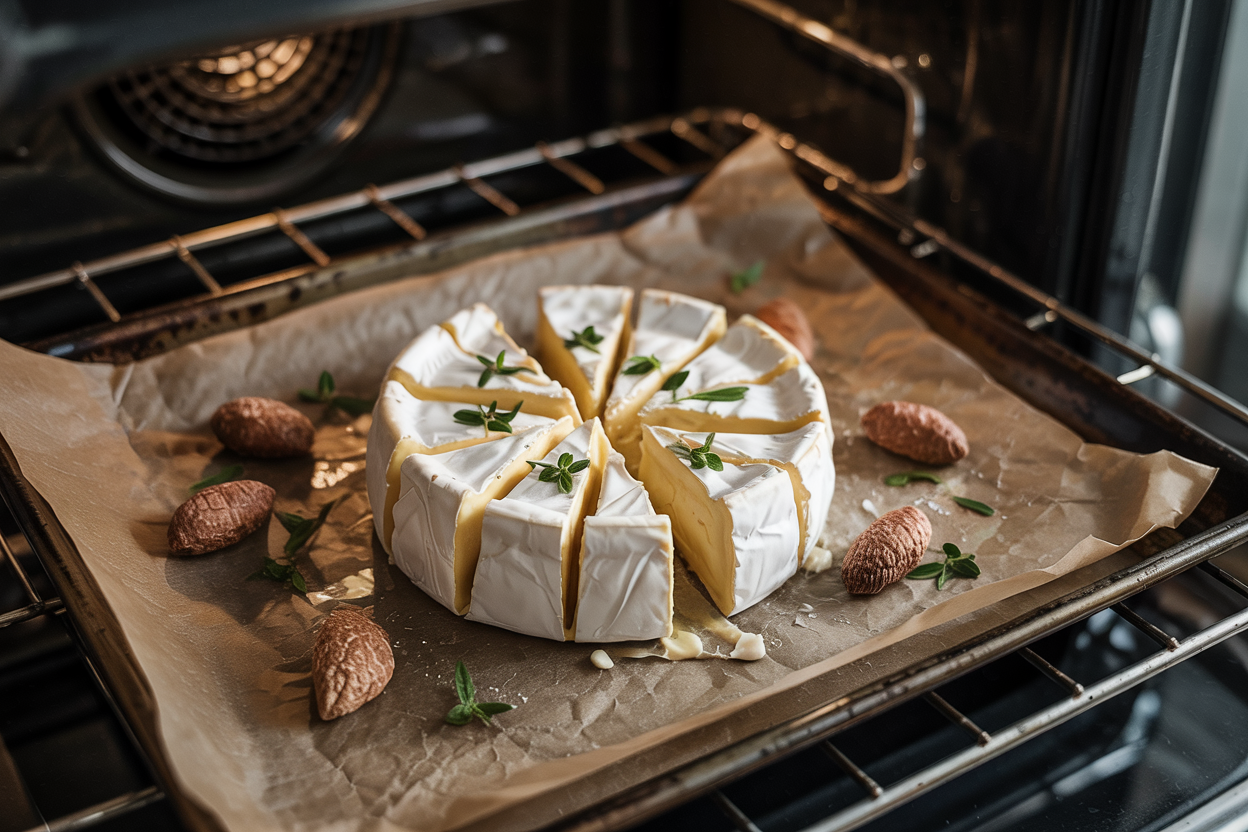 Place the brie in the oven and bake for 10โ12 minutes, just until soft and slightly melted. Donโt overbake or it will lose shape.