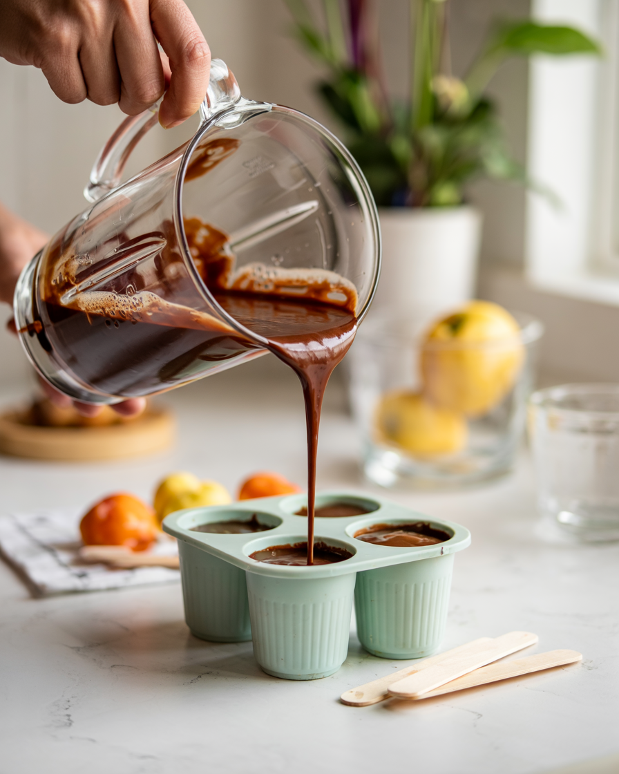 Carefully pour the thick, blended chocolate liquid into a silicone popsicle mold, filling each cavity to just below the brim to allow room for slight expansion as it freezes. Insert the wooden popsicle sticks straight down into the center of each cavity, ensuring they stand upright and are submerged at least halfway into the liquid.