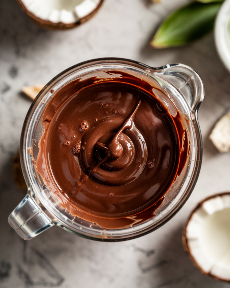 Pour the entire can of full-fat coconut milk, the vegan chocolate protein powder, the dark cocoa powder, and the maple syrup into a high-speed blender. Blend on a medium-high setting for roughly sixty seconds. You must ensure that the protein powder and cocoa are completely dissolved and the mixture resembles a thick, glossy, and perfectly smooth chocolate pudding.