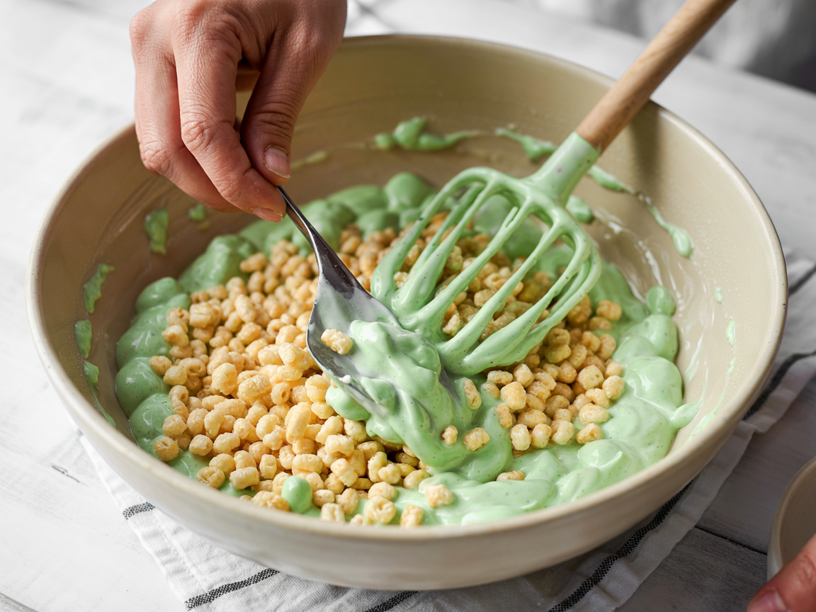 Pour in the crispy rice cereal and fold until evenly coated.