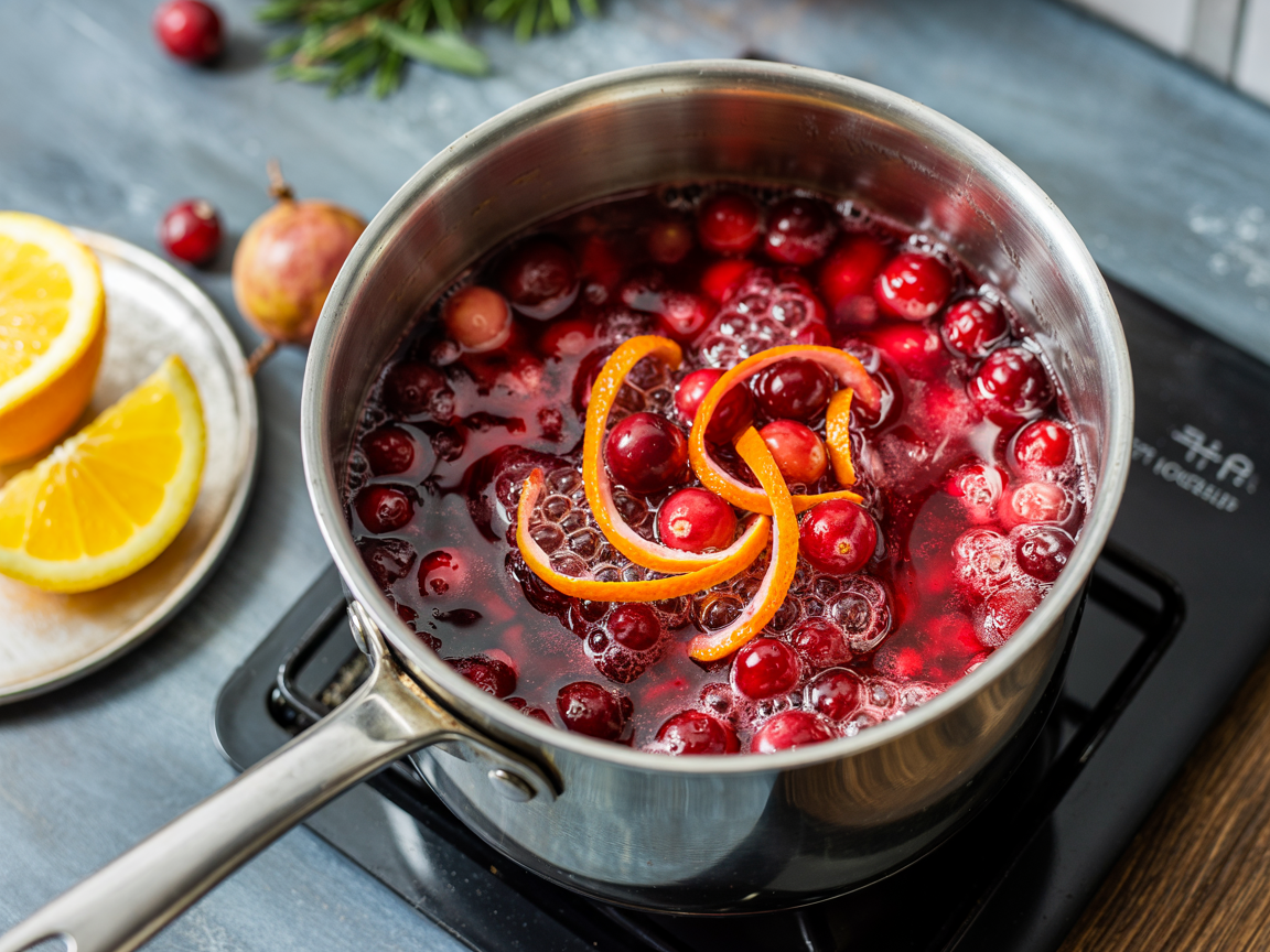 Simmer cranberries, sugar, water, cinnamon, and orange zest until thick and glossy.