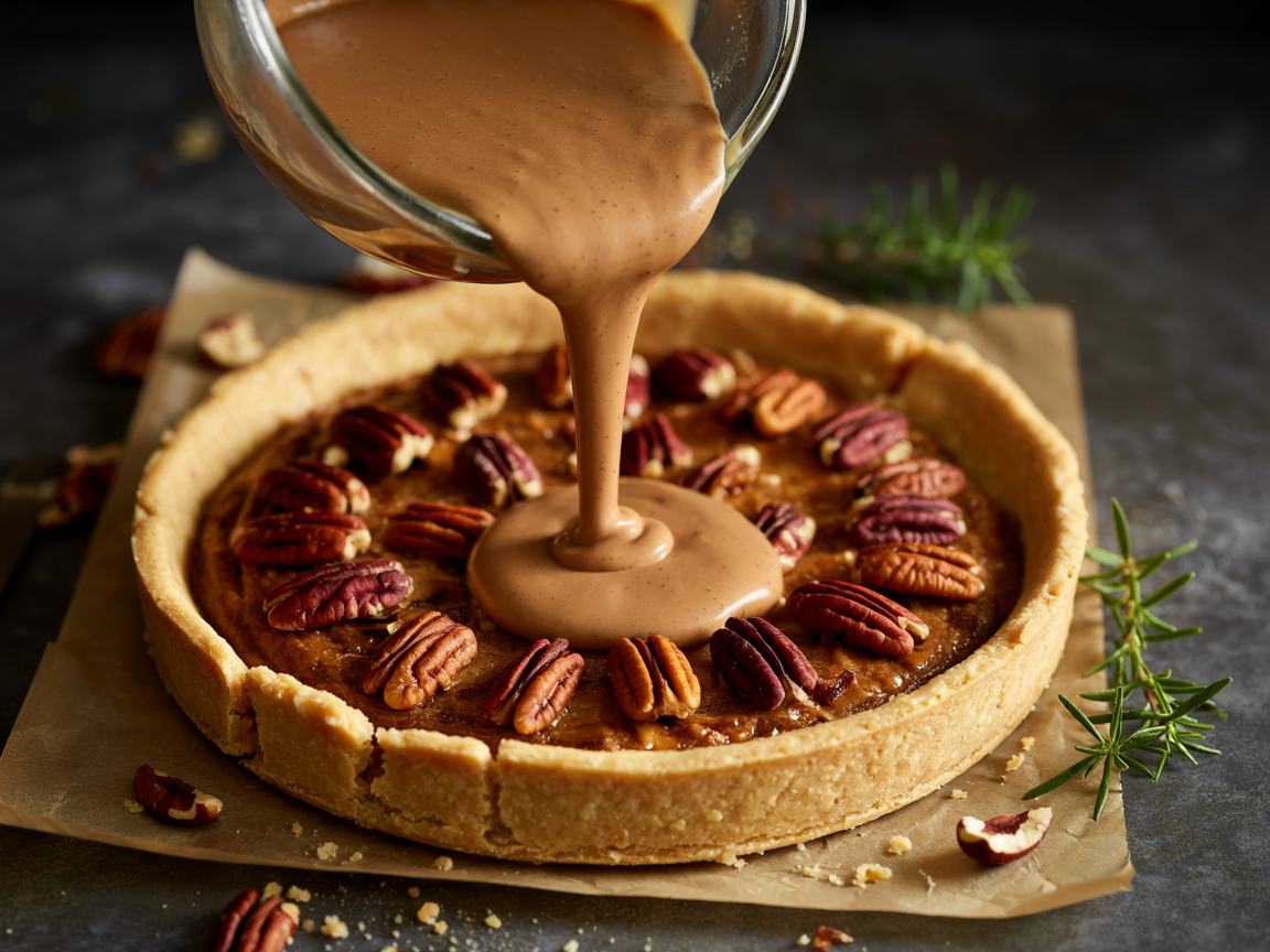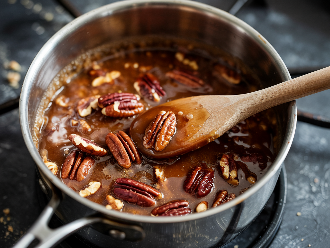 Heat vegan butter, brown sugar, and maple syrup until melted and glossy. Stir cornstarch + water slurry in to thicken, then add vanilla and pecans.