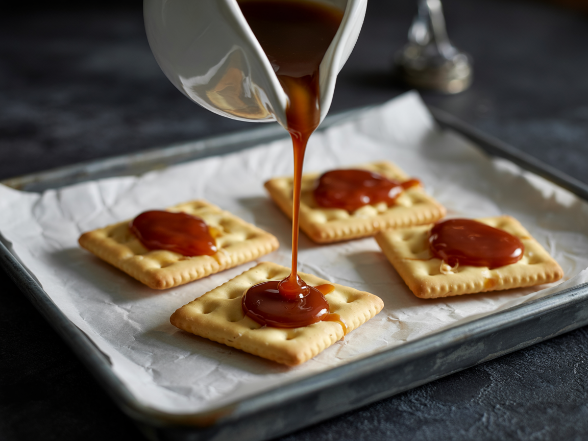Pour the hot toffee mixture evenly over the crackers.