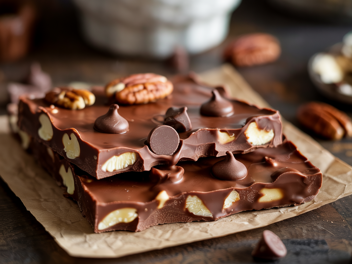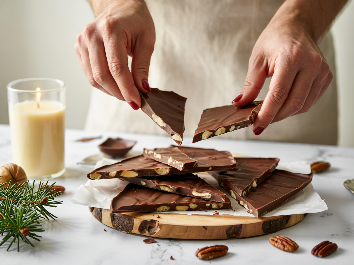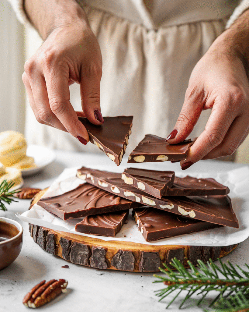 The texture is everything: crunchy base, chewy pecans, silky chocolate, and that golden toffee layer that shatters ever so slightly when you bite into it. The combination tastes like a cross between pecan pie, toffee, and classic holiday bark — cozy, rich, and perfect for winter gifting or snacking.