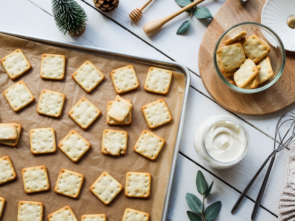 Lay a sheet of parchment paper and arrange crackers in a single layer.
