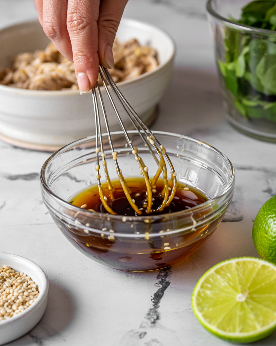 In a small bowl, whisk together soy sauce, rice vinegar, lime juice, maple syrup, sesame oil, olive oil, and sesame seeds until fully combined.