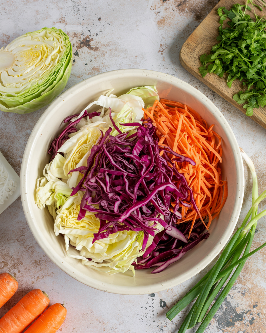Thinly shred green cabbage and red cabbage using a sharp knife or mandoline. Add to a large mixing bowl with shredded carrots and green onions.
