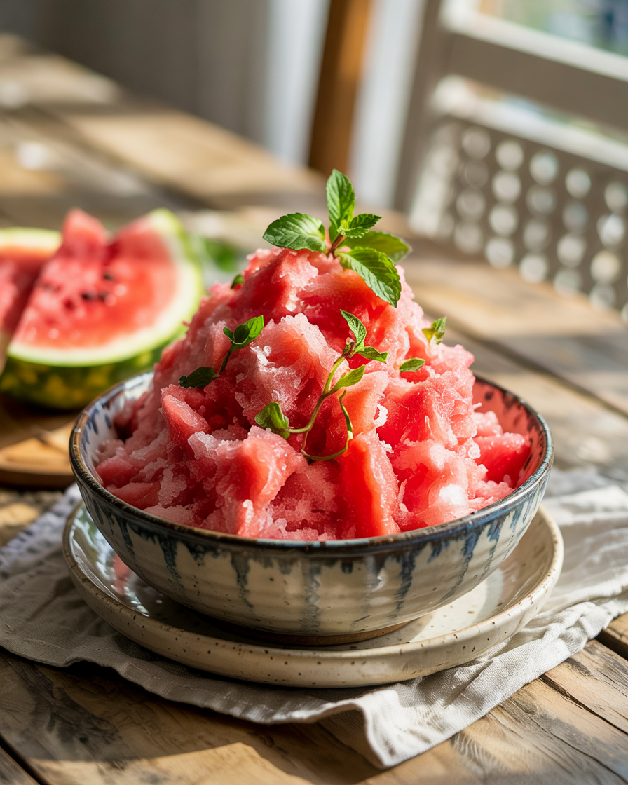 Do not skip the pinch of flaky sea salt on top of the finished snow; the sodium is scientifically required to block the bitter receptors on the tongue, which intensely amplifies the perception of the watermelon's natural sweetness.