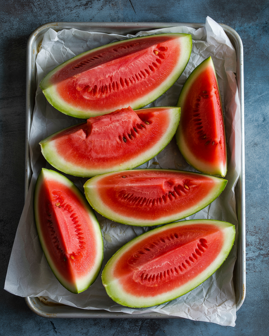 Slice your seedless watermelon into large, holdable wedges or blocks. Place the blocks on a parchment-lined baking sheet, ensuring they do not touch. Place the baking sheet in the coldest part of your deep freezer for a minimum of eight hours, or ideally overnight. The watermelon must be completely rock-solid; if the center is even slightly soft, it will turn to slush on the grater rather than fluffy snow.