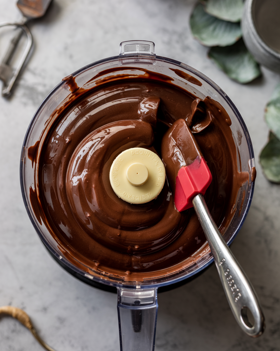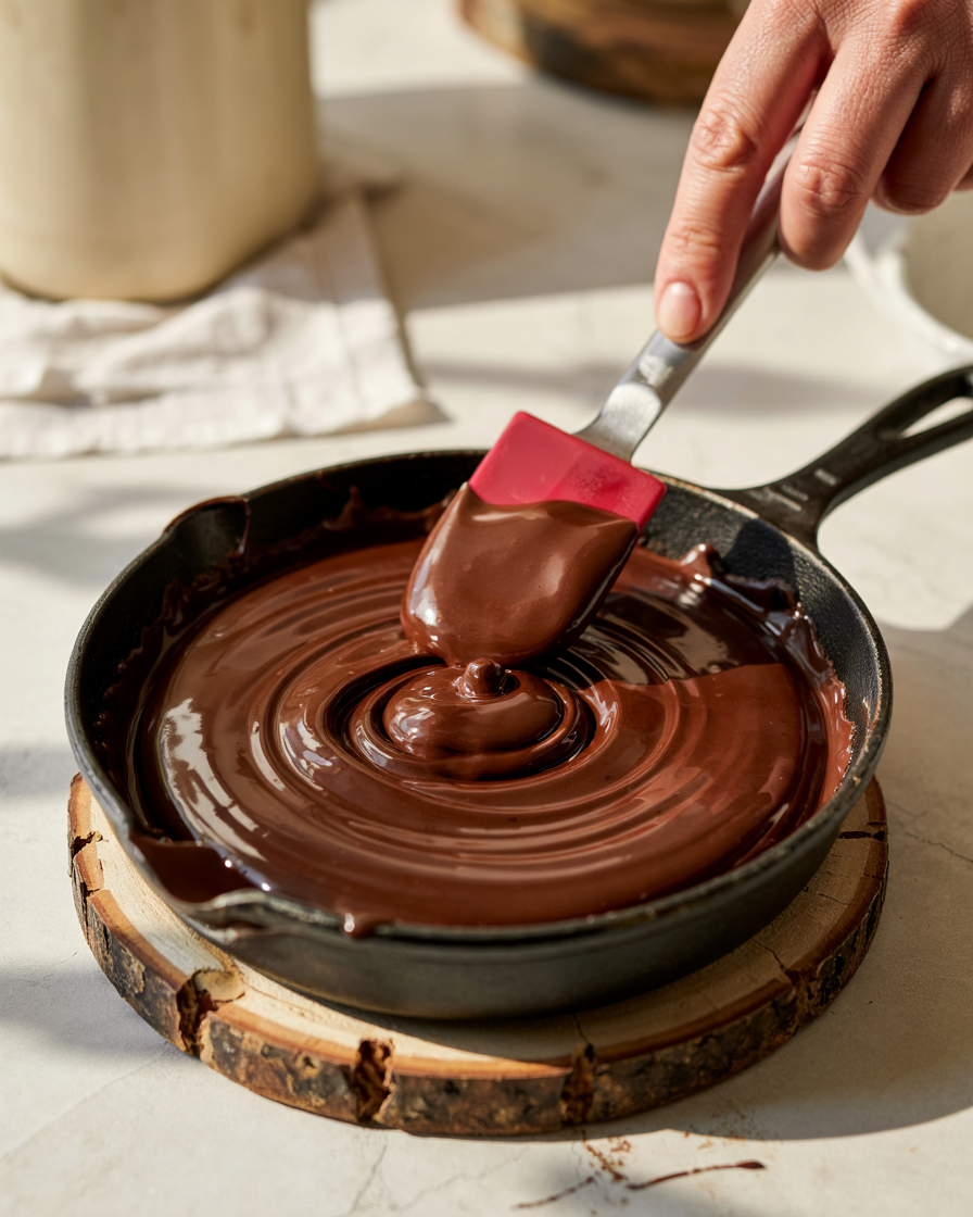 Take a small, oven-safe cast-iron skillet (roughly 6 to 8 inches in diameter) or a shallow ceramic baking dish. Using your silicone spatula, scrape the entire batch of the thick chocolate protein emulsion directly into the skillet. Spread it out into a smooth, even layer that completely covers the bottom of the pan.