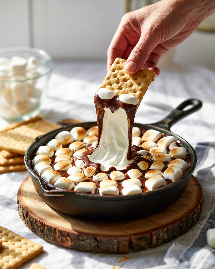 Place the hot cast-iron skillet onto a heat-proof wooden serving board. Surround the skillet with a massive pile of crisp, low-fat graham crackers and fresh strawberry slices for dipping. Serve absolutely immediately while the marshmallows are molten and stretchy. Plunge a graham cracker directly through the golden crust, capturing the gooey marshmallow and the warm, thick chocolate fudge in a single, mind-blowing bite.