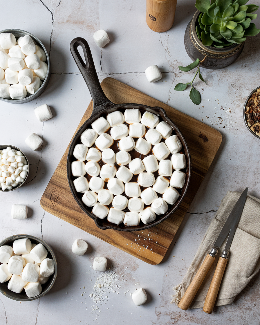 Set your oven to the high "Broil" setting and place the oven rack roughly six inches from the heat source. Place the skillet directly under the broiler. Watch it incredibly closely—do not walk away! Within two to four minutes, the intense heat will cause the vegan marshmallows to rapidly expand, puff up, and turn a beautiful, charred golden-brown. Once the tops are perfectly toasted, carefully remove the hot skillet from the oven.
