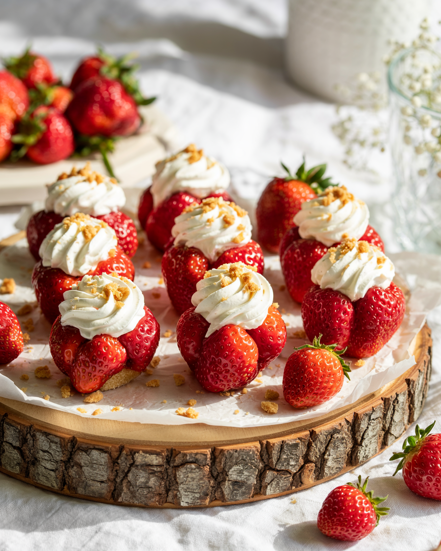 Place your finely crushed graham cracker dust into a small, shallow bowl. Take each fully piped strawberry and very gently invert it, lightly dipping the very top of the white cream crown into the golden graham cracker dust. The crumbs will adhere instantly to the tacky cream. Arrange the finished, dusted strawberries on a beautiful serving tray. Serve absolutely immediately, or chill for thirty minutes to firm up the cream for the perfect, messy-free picnic experience.