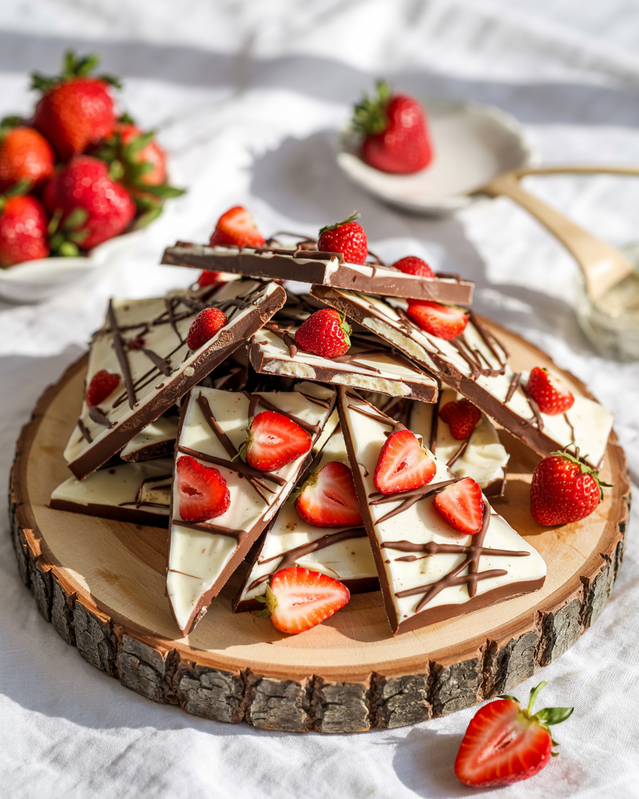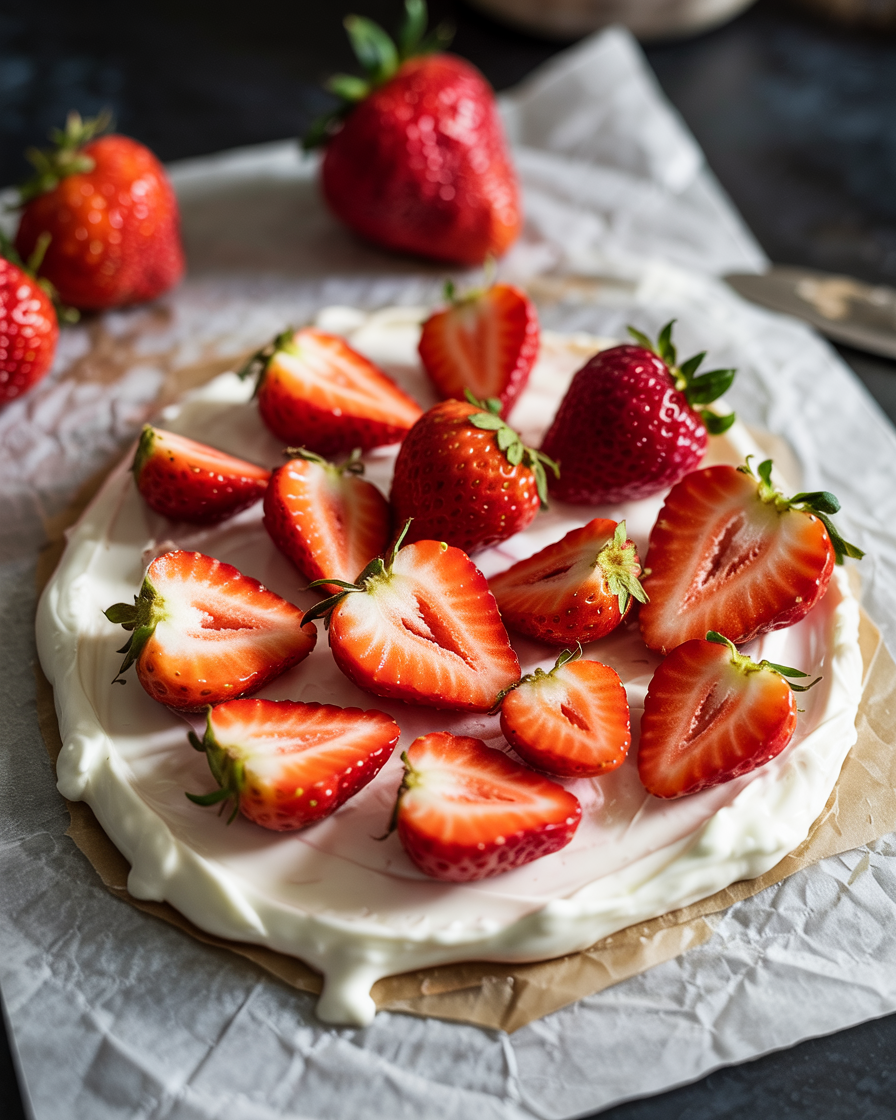 The viral Pinterest sensation, completely optimized for your weight-loss macros! A massive, vibrant sheet of high-protein vanilla yogurt, heavily loaded with fresh sliced strawberries and drizzled with a snappy dark chocolate magic shell. Freeze, shatter, and enjoy the ultimate low-calorie summer candy!