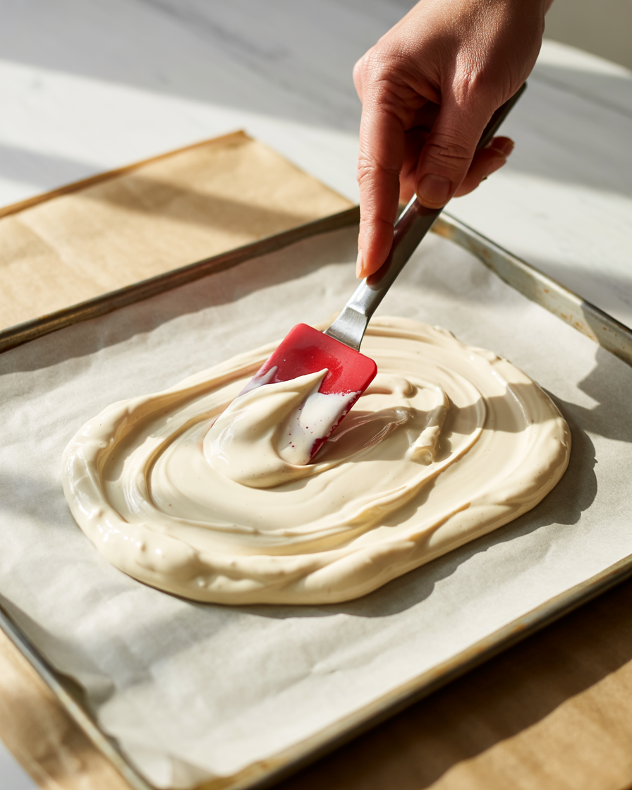 Line a large, rimmed metal baking sheet with a piece of high-quality parchment paper. Using a large silicone spatula, scrape the entire bowl of the vanilla protein yogurt mixture directly into the center of the parchment. Gently spread the thick yogurt outwards into a massive, even rectangle, roughly ¼-inch thick. Ensure the edges are not too thin, or they will freeze faster than the center and become brittle.