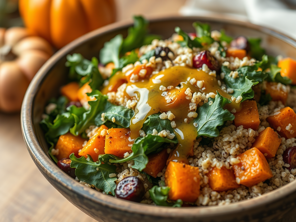 It’s hearty enough to be a full meal yet light enough to leave you feeling refreshed. The roasted sweet potatoes bring caramelized sweetness, the quinoa adds a fluffy protein base, and the kale ties it all together with a bit of crunch. But the true star? The maple vinaigrette — a perfect balance of sweet, tangy, and nutty that makes every bite burst with cozy fall flavor.