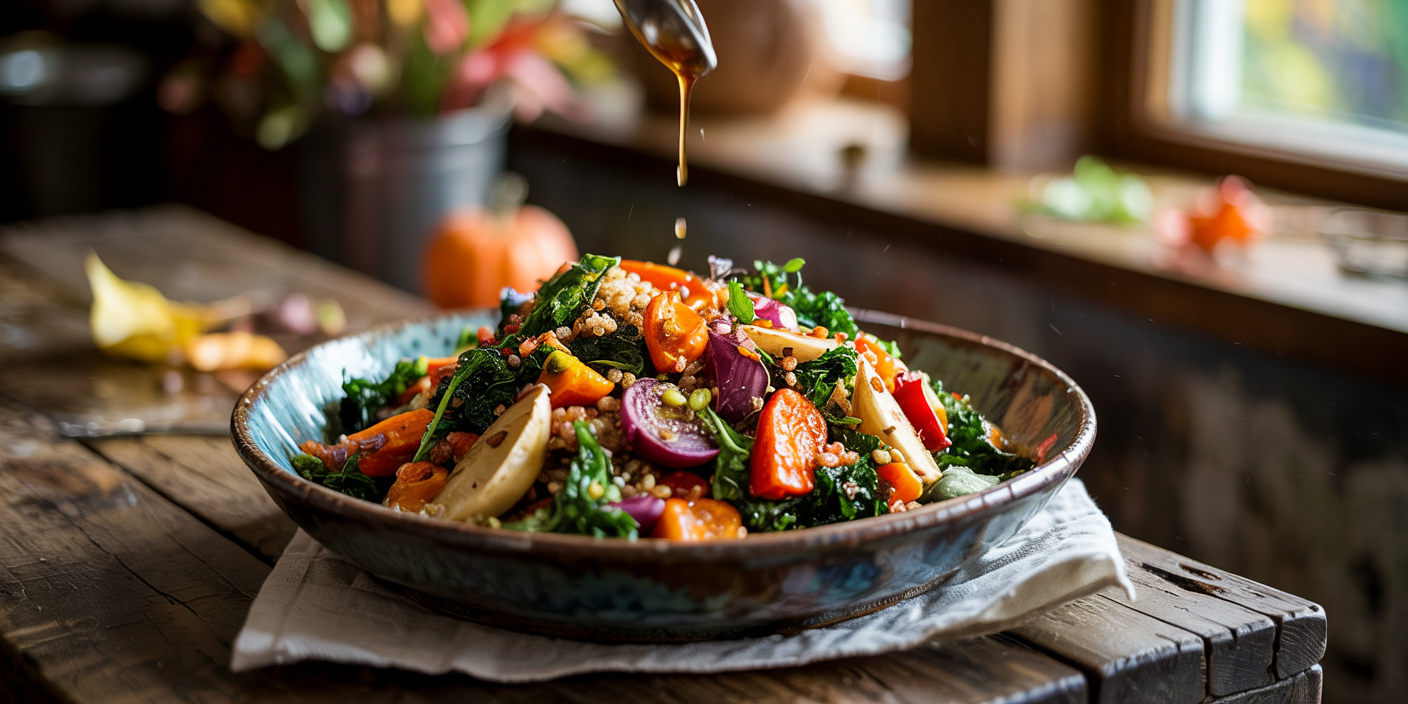 It’s hearty enough to be a full meal yet light enough to leave you feeling refreshed. The roasted sweet potatoes bring caramelized sweetness, the quinoa adds a fluffy protein base, and the kale ties it all together with a bit of crunch. But the true star? The maple vinaigrette — a perfect balance of sweet, tangy, and nutty that makes every bite burst with cozy fall flavor.
