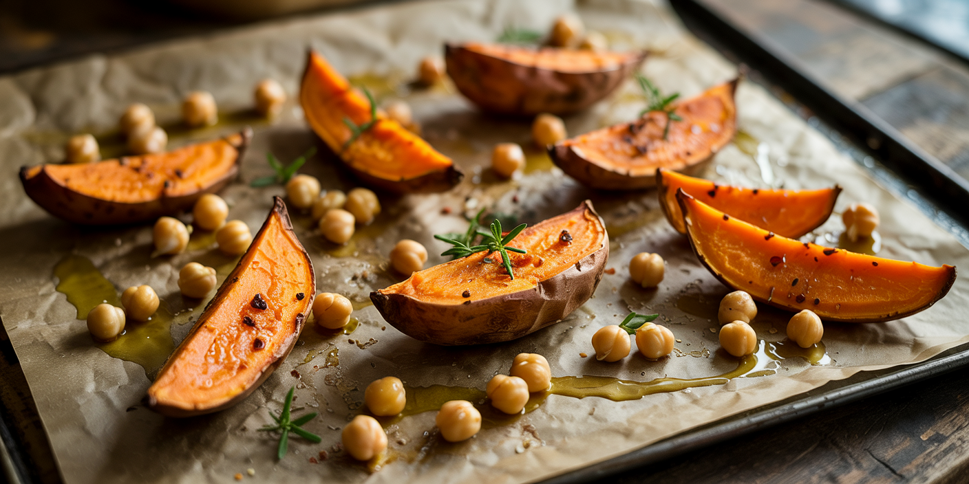 Preheat oven to 400°F (200°C). Toss sweet potatoes and chickpeas with olive oil, salt, and pepper. Spread on a baking tray and roast for 25 minutes, flipping halfway.