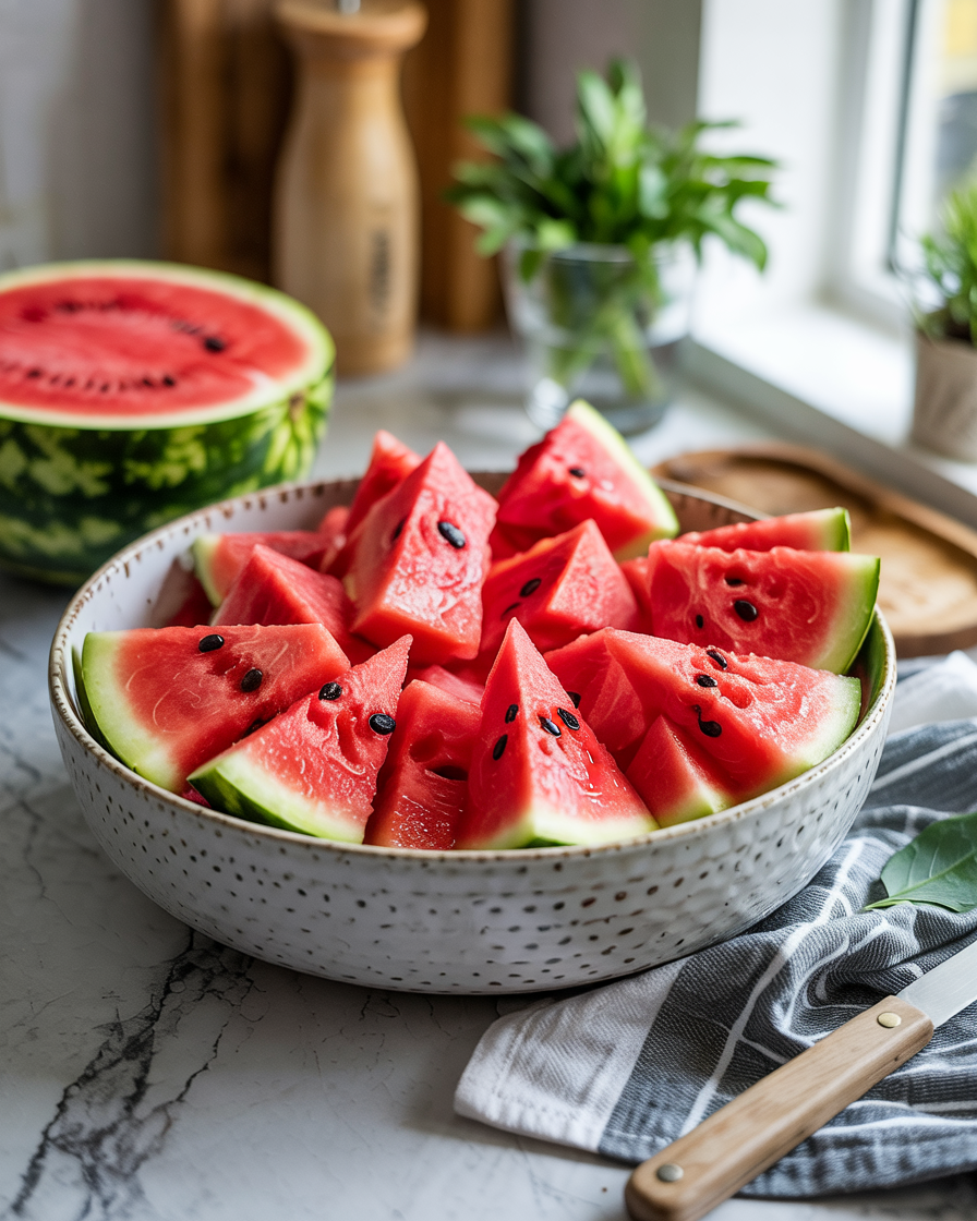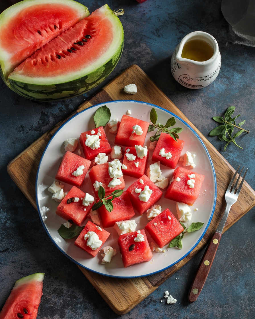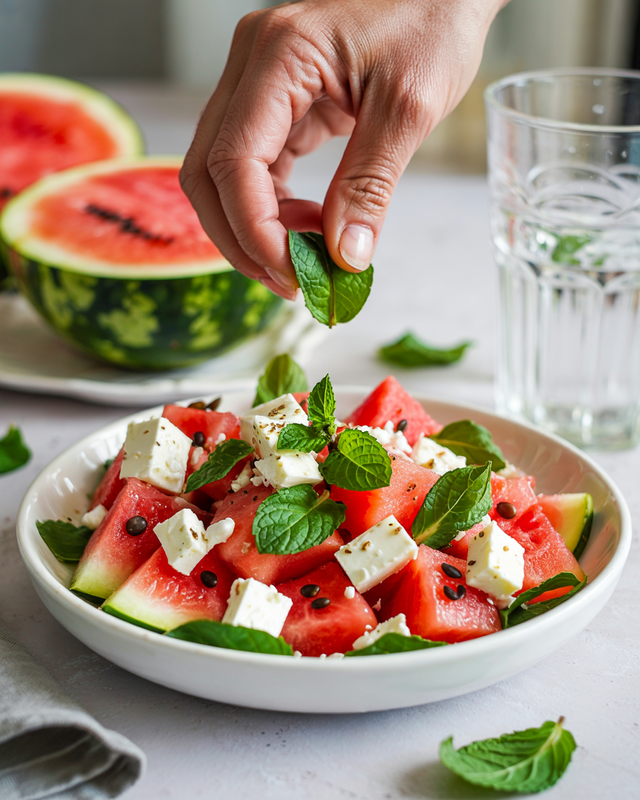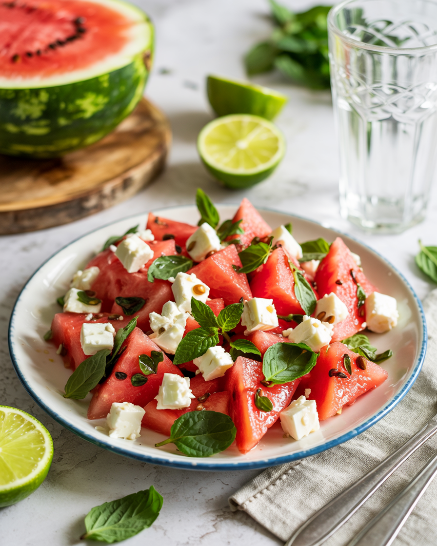 Use cold watermelon for best contrast. Add feta just before serving to maintain structure. Mint should be fresh and chopped lightly — not bruised.